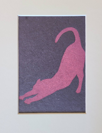 Downward Cat - Stretching Cat Print - Linocut Print on Handmade Blue Paper - LinoCat Collection