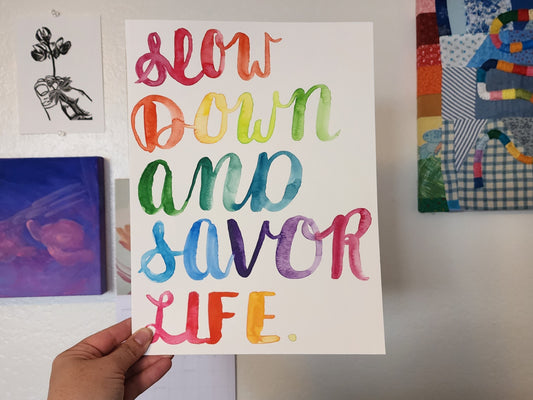 Slow Down and Savor Life ORIGINAL Watercolor Rainbow Handlettered Quote